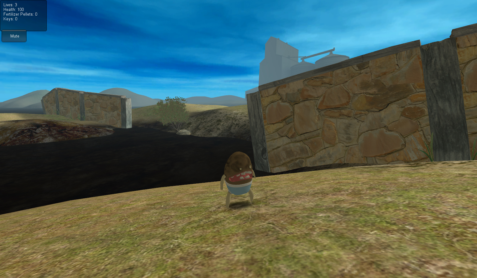 I've already started work on the exit area for level 03. Here you can see the stone and wood wall that fences in the Grain Elevator which is the next level for Bud the Spud to deal with. In the center of that mud bog between the walls is where I am going to place an exit pipe that will take bud to the 4th level so long as he has collected the two keys necessary to unlock the door to the pipe.