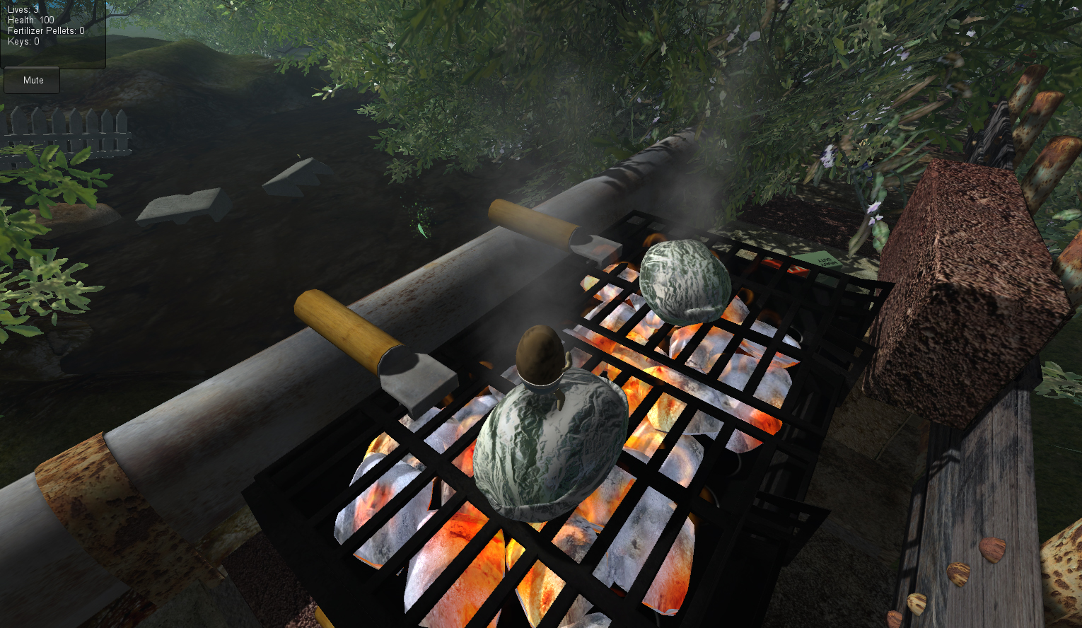 I finally got the final two deadly mud bog areas worked out in level 02. Here we can see Bud the Spud standing on top of a tin foil wrapped potato baking on the Hibachi overlooking one of the final mud bogs. You can see the key sitting on the cinder block in the middle of the bog, you can also see an extra health potato leaf pick up item as well hovering in the air over another cinder block below. In the next image you can see it as well.